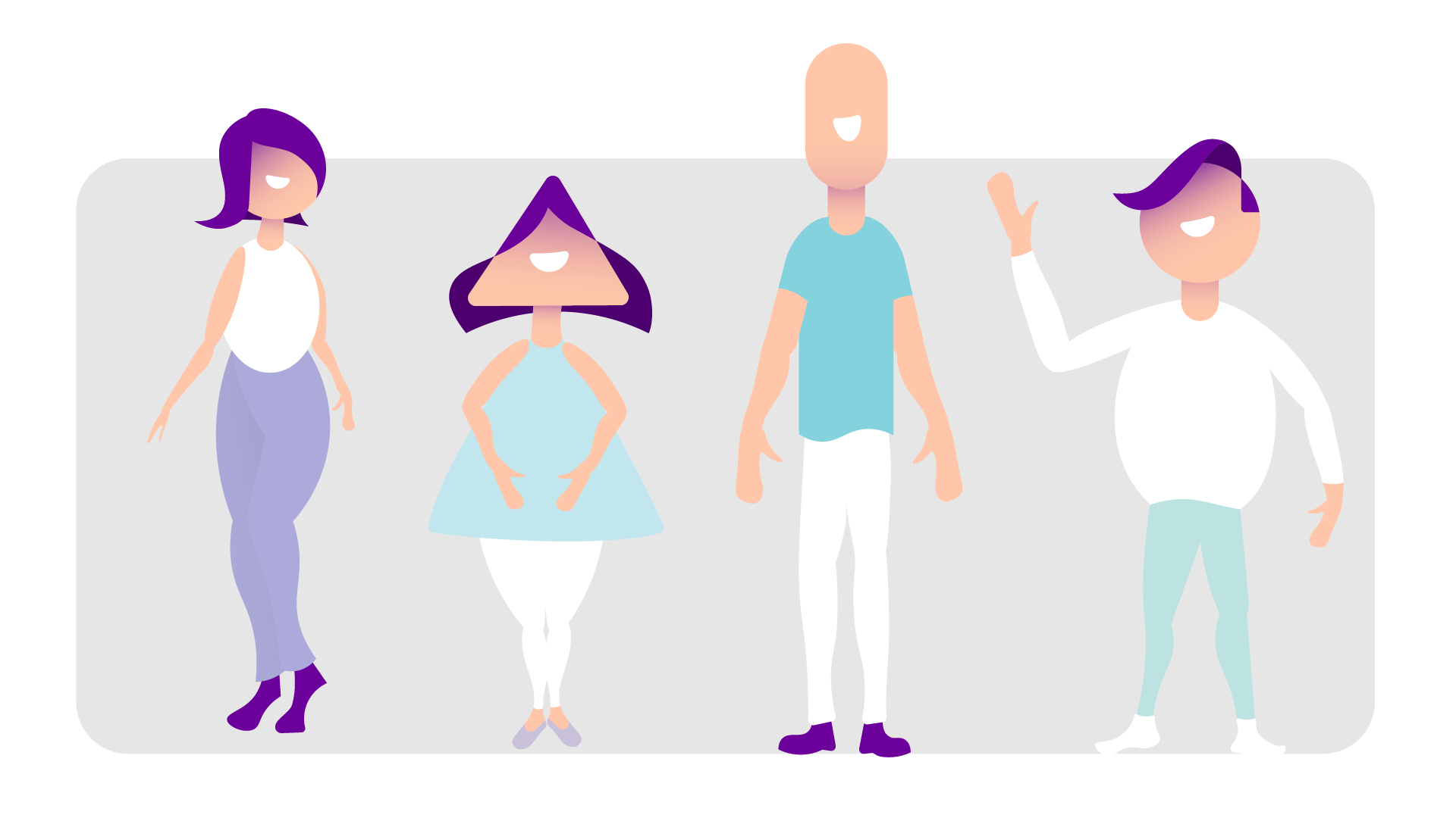 Yollty had already developed the little character ambassadors for their website, so I was asked to design the human characters for the animation in a cohesive style. Therefore, the same geometric shapes of the little Yollties where adopted for the heads of the new characters, as well as the same colour palette.